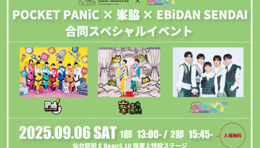 日程:2025年9月6日(土) 時間:1部 1 … 続きを読む POCKET PANiC×峯脇×EBiDAN SENDAI 合同スペシャルイベント開催決定!!