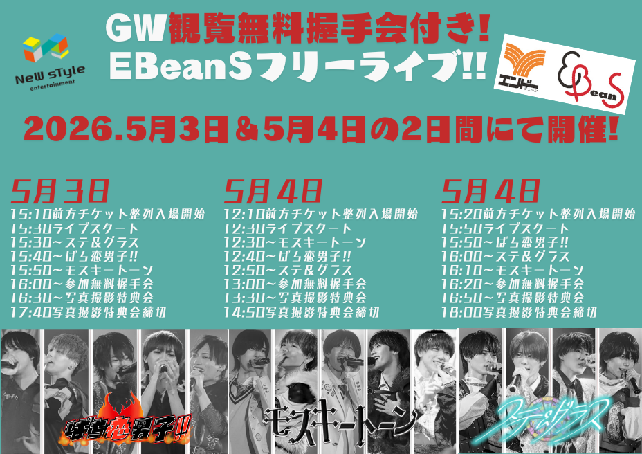 ばち恋男子!!・モスキートーン・ステ&グラス E BeanSフリーライブ開催!!
