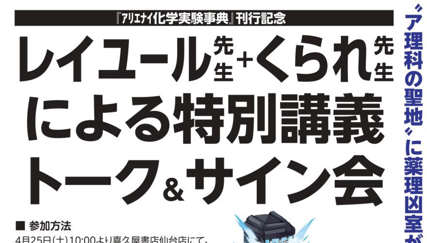 「アリエナイ化学実験事典」刊行記念! #レイユール 先生+ … 続きを読む 『アリエナイ化学実験事典』刊行記念 レイユール先生+くられ先生による特別講義トーク&サイン会開催!